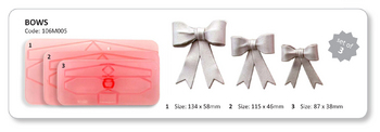 Large Bows – Set of 3 Een mooie set met strik uitstekers – size 4-6ÿ(medium & large)ÿvoor het maken van 3 formaten strikken. Uitstekers hebben de volgende afmetingen: maat 4: 87mm lang x 38mm hoog maat 5: 115mm lang x 46mm hoog maat 6: 134mm lang xÿ58 mm hoog Met ingesloten engelstalige instructieÿ