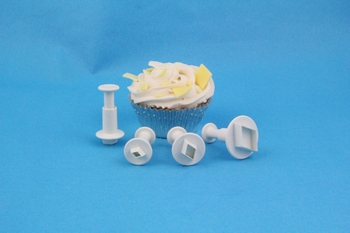 Miniature Diamond Plunger Cutter Set of 4 Gedetailleerde plunger cutter set Diamond (ruit). Door het handige (plunger) uitdruksysteem, steek je makkelijk een ruit uit. Afmetingen: circa 0,6 cm, 1 cm, 1,4 cm, 2,5 cm.
