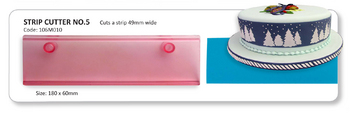 Strip Cutter No. 5 De JEM Strip Cutter is een uitsteker waarmee je meerdere perfect rechte stroken tegelijkertijd kunt uitsteken. Handig bij het decoreren van prachtige taarten of cupcakes. Deze uitsteker leent zich met uitstek voor het maken van strikken, draperin of swags voor langs een taart. Maar ook voor het bekleden van mini taartjes of mergpijpjes. Er zijn in totaal 5 verschillende breedtes verkrijgbaar. Afmeting: 50 mm breed en 18 cm lang. Met ingesloten Engelstalige instructie.ÿ